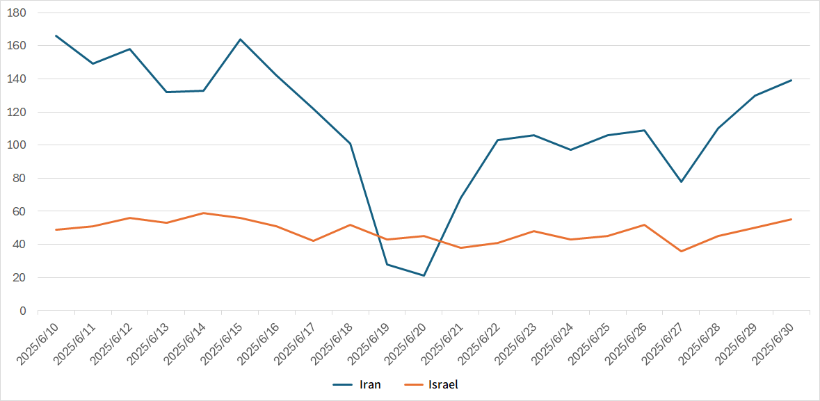 Between June 13 and around June 25, 2025, military conflict occurred between Israel and Iran. During this period, fluctuations were observed in packets originating from Iran. This section focuses on these changes. Figure 1 shows the number of unique IP addresses per day originating from Iran and Israel during June.