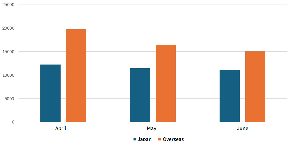 Figure 2 is a monthly comparison of the average number of packets received in Japan and overseas. While overseas sensors received more packets than those in Japan, both of them recorded the highest number in April, with a gradual decrease in the following months.